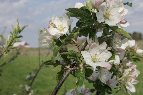 Red Delicious in bloom. Blooms are clustered on short fruiting spurs.