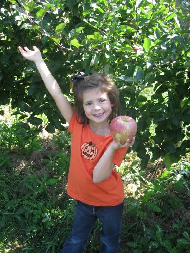 Abby found the largest apple. Almost as big as her head!