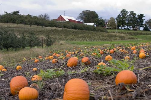 Another picture of the pumpkin patch. Apples to the left, blueberries in the middle, and plums and cherries at the top of the hill.